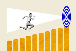 Creative collage picture young woman runner persistence determination goal achievement target inspiration motivation leadership